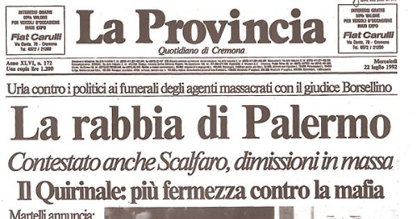 Momenti di forte tensione ai funerali dei cinque agenti di scorta del giudice Borsellino. Al termine del rito, alcuni colleghi delle vittime hanno stretto minacciosamente le autorità politiche presenti, strattonando lo stesso capo dello Stato, Scalfaro, giunto a Palermo assieme al presidente del Consiglio, Amato, e al capo della polizia, Parisi. In un incontro con Amato, Mancino, Martelli, Andò e Galloni il presidente della Repubblica ha auspicato maggior fermezza nella lotta alla mafia. E più poteri avrà il procuratore nazionale antimafia (i termini della sua nomina potranno essere riaperti): è questa una delle principali novità contenute negli emendamenti al decreto Scotti-Martelli approvati dal consiglio dei ministri. A Palermo si sono dimessi il sindaco e il sostituto procuratore, preannunciate le dimissioni di altri sette magistrati.