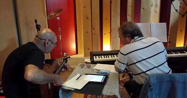 Maurizio si isola in uno studio dell’Elfo per comporre alla tastiera, Gianni fa la stessa cosa, all’aperto, con la chitarra e intanto butta giù i testi che poi Rosy (sua moglie e manager della band) trascrive al computer (vedi la fotogallery della giornata). Anche sui testi ci si confronta, si condividono le parole messe sul foglio, poi se una non convince, si cerca la parola da sostituire, ma deve rispettare la metrica, quindi un semplice sinonimo a volte non serve a nulla.