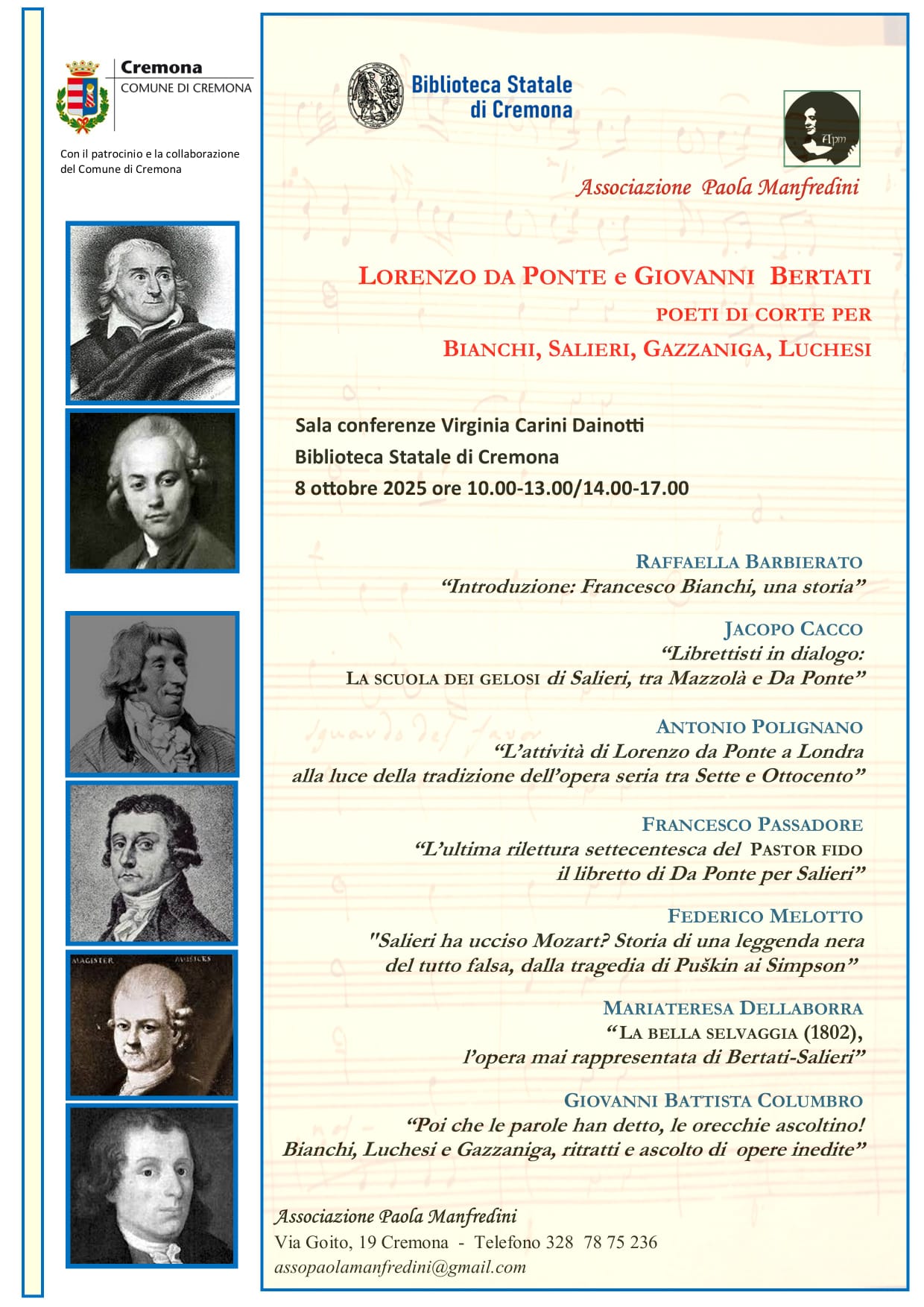 L'Associazione Paola Manfredini in collaborazione con la Biblioteca Statale di Cremona organizza una giornata di studi sulle figure dei librettisti Lorenzo Da Ponte e Giovanni Bertati.