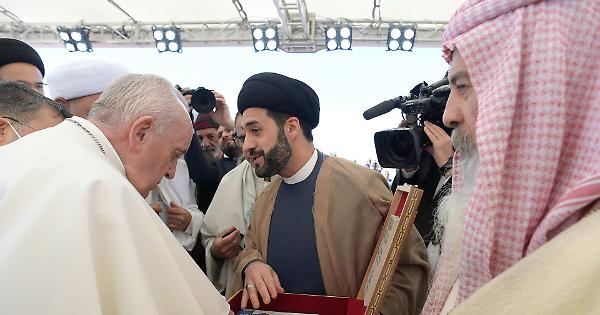 UR (6 marzo 2021) - Continua la visita apostolica di papa Francesco in Iraq. Dopo l'appello di ieri a fermare violenze, guerre e fondamentalismi che hanno fatto dell’Iraq «una terra martoriata», la giornata è cominciata con uno dei principali appuntamenti del viaggio, l'incontro con l’ayatollah Al-Sistani, massima autorità religiosa degli sciiti. Poi a Ur dei Caldei, per pregare con i rappresentanti delle altre religioni. Nel pomeriggio ritorno a Baghdad per la messa in rito caldeo, prima volta per un pontefice.