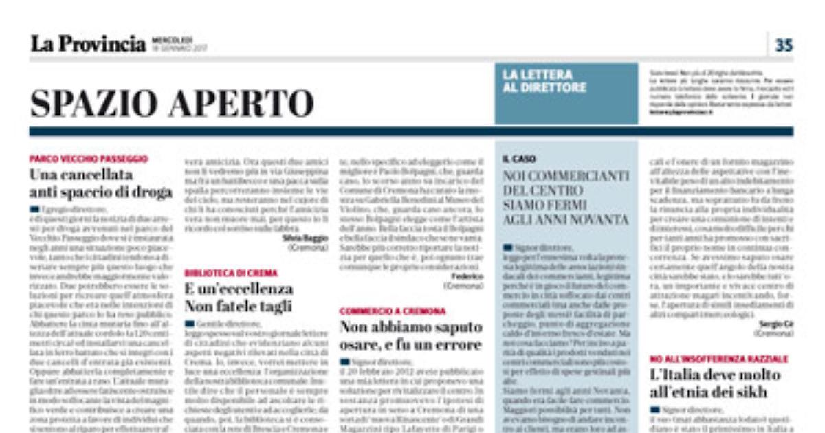 leggo spesso sul vostro giornale lettere di cittadini che evidenziano alcuni aspetti negativi rilevati nella città di Crema. Io, invece, vorrei mettere in luce una eccellenza: l’organizzazione della nostra biblioteca comunale. Inutile dire che il personale è sempre molto disponibile ad ascoltare le richieste degli utenti e ad accoglierle; da quando, poi, la biblioteca si è consociata con la rete di Brescia e Cremona e ha messo in atto il prestito interbibliotecario, l’utente ha a disposizione una consistente quantità di libri di genere vario. Quando non c’era questa possibilità, per la ricerca di testi che Crema non aveva ci si doveva recare alle biblioteche di Milano o altrove. Ora, con una semplice richiesta, che addirittura si può fare via Internet, si trova il testo in altre biblioteche e nel giro di pochi giorni arriva presso la biblioteca di Crema. Un plauso a questa organizzazione che mi auguro continui nel tempo e che non venga eliminata con la solita scusa dei costi insostenibili.