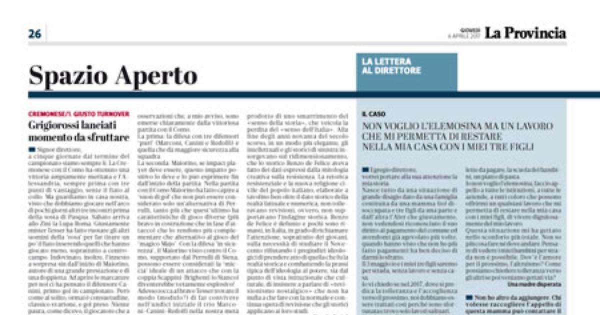 alla cortese e apprezzata risposta del signor Ratti alla mia lettera del 4 aprile, vorrei ribadirei in modo altrettanto cortese e spero costruttivo con due osservazioni che, a mio avviso, sono emerse chiaramente dalla vittoriosa partita con il Como.