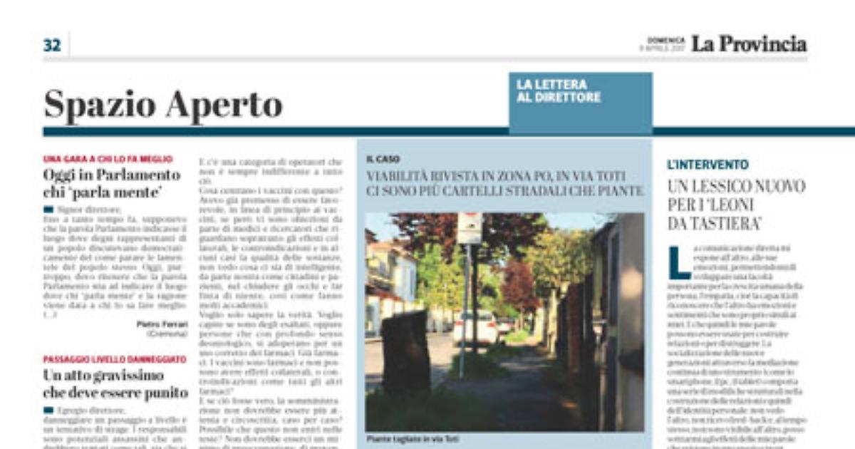 Dopo il riordino recente della viabilità nel quartiere Po, in via Toti sono presenti più cartelli stradali che piante, vi invito a contarli. Un tempo la via in questa stagione era una delle più belle del quartiere con tutte le piante fiorite, ora purtroppo parecchie piante sono morte e non sono mai state sostituite, restano solo i fusti tagliati. Vorrei sapere come mai via Toti non è stata compresa tra quelle oggetto della recente ripiantumazione di vie del circondario (via Serio, viale Po), siamo forse cittadini di serie B e se c’è in programma una sostituzione delle piante morte da parte dell’amministrazione comunale prossimamente.