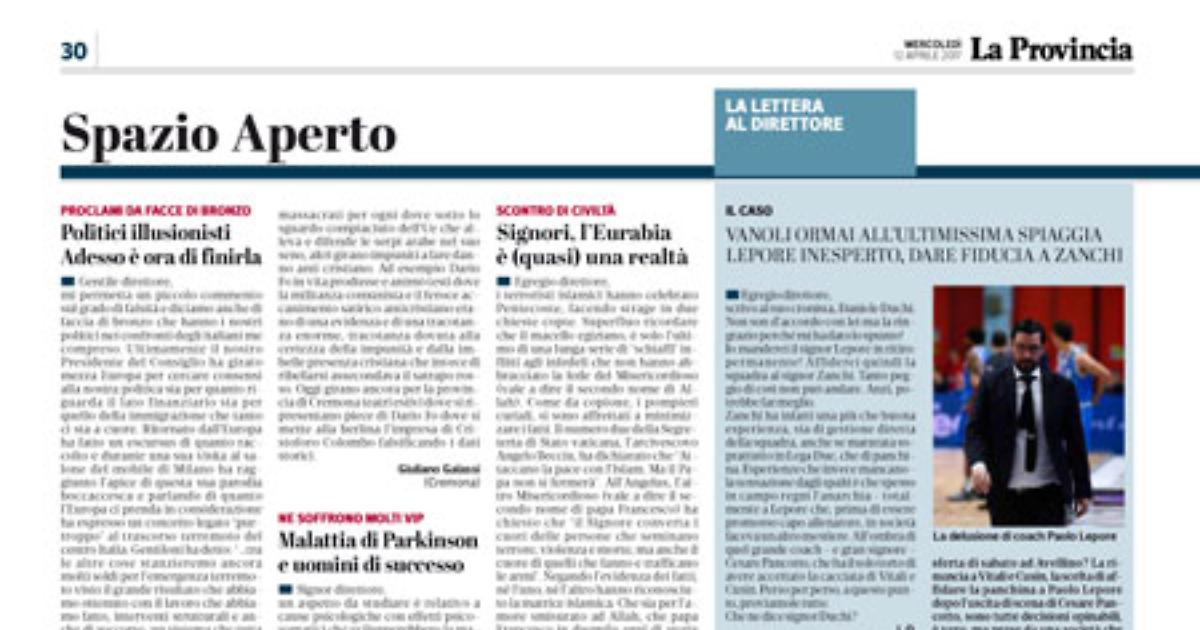 Risponde Daniele Duchi. Caro Olivetti, al temine del commento della gara di domenica ho voluto lanciare una provocazione: visto che è servito ai giocatori di Pesaro per espugnare (con determinazione ma anche fortuna) il campo di Brindisi, perché non portare in ritiro punitivo l’intera squadra biancoblu in vista della trasferta di sabato ad Avellino? La rinuncia a Vitali e Cusin, la scelta di affidare la panchina a Paolo Lepore dopo l’uscita di scena di Cesare Pancotto, sono tutte decisioni opinabili, è vero, ma prese da una società che ha sempre dimostrato di seguire un percorso specifico. Sono stati fatti errori? Sicuramente. Ma lo sconforto stampato sul volto di Aldo Vanoli la dice lunga su come il patron stia vivendo con grande frustrazione questo momento difficile. Ma il campionato non è finito e rimangono 4 gare per riguadagnare il terreno perso. A fine stagione la proprietà farà le proprie valutazioni.