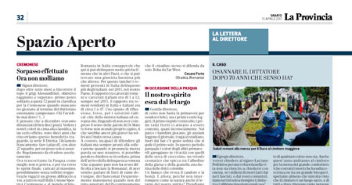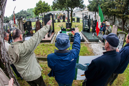 Mi sembra che lui dopo più di settant’anni sentendosi orgoglioso di aver fatto parte di gente comandata da un fanatico che ha ridotto un paese alla fame e riempito i cimiteri con delle guerre demenziali sia rimasto semplicemente un pochino indietro nel tempo e non sia riuscito a capire e a godersi questa democrazia e libertà patacca che lui disprezza ma che ha usato. Anche un solo morto ha il sacrosanto diritto di essere rispettato di qualsiasi colore esso sia. Anche quest’anno andranno al cimitero per la messa del grande condottiero (che con tutti i morti che ha sulla coscienza ne ha un grande bisogno), speriamo almeno che stavolta visto che il cimitero è un luogo sacro, e di tutti e dove riposano tante persone che in vita non la pensava senz’altro come loro, non facciano come sempre gesti simbolici e nostalgici che poco hanno in comune con il luogo e con una funzione religiosa, visto che si vogliono dimostrare bravi cristiani basta un bel segno della croce che non fa male a nessuno.