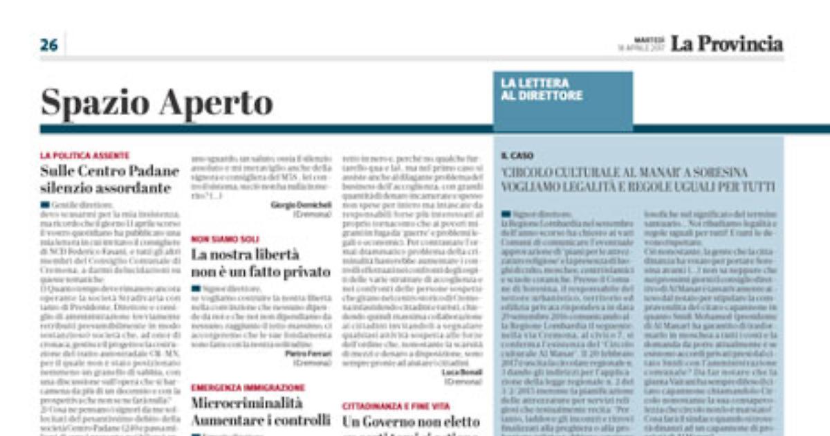 'Circolo culturale al Manar' a Soresina. Vogliamo legalità e regole uguali per tutti