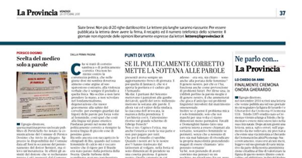 questa mattina presso un locale pubblico di Persichello ho notato la comunicazione del Comune di Persico Dosimo che invio in allegato. Apprezzo la disponibilità del Comune data all’Asst in occasione del pensionamento del dottor Bernieri, ma rilevo un’inesattezza. In effetti gli assistiti del dottore che si recheranno presso i siti preposti dal Comune, non avranno alcuna possibilità di scelta ma firmeranno il modulo ‘Scelta medico di famiglia’ unicamente a favore della dottoressa Cianci. Credo fosse doveroso specificare questo piccolo ‘particolare’.