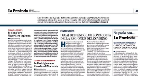 Ho appreso della proposta di sensibilizzare la politica, mediante una mobilitazione di protesta nei confronti del servizio ferroviario, sul drammatico problema vissuto da troppo tempo dai pendolari cremonesi e divenuto ormai insostenibile. Nei confronti di tale protesta, convocata per giovedì prossimo, non posso che essere d’accordo, essendo io stesso cittadino del territorio interessato ed avendo, quindi, ben chiare le problematiche che si vogliono portare all’attenzione dell’opinione pubblica.