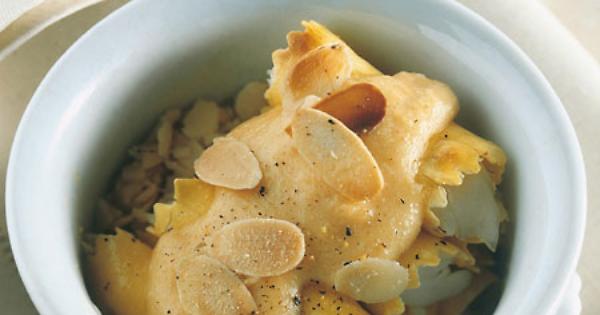 Cuocete a fiamma bassa per 5-6 minuti. Imburrate quattro pirofile monoporzione, distribuite sul fondo di ognuna la maggior parte della salsa, appoggiatevi due o tre cannelloni e ricoprite con il resto della salsa. Decorate con le mandorle restanti, ridotte in lamelle e cuocete in forno a 200°C 15 minuti.