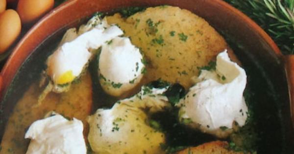 Ingredienti (per 6 persone). 4-5 fette di pane casereccio, una tazza di olive nere, 6 uova, sale, pepe in grani, 1,5 l di brodo, 4 cucchiai di olio extravergine di oliva, 1 mazzetto di basilico, 4 spicchi d'aglio, una manciata di prezzemolo, 1 rametto di rosmarino.