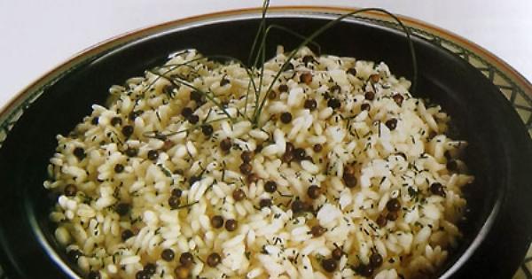 Ingredienti: 250 gr di riso Carnaroli, 1 cucchiaio di pepe verde, 1 cipolla piccola, 60 gr di burro, 1/2 bicchiere di vino bianco secco, 1 mazzetto di erba cipollina (o prezzemolo), 1,5l di brodo (meglio se di carne), 2 cucchiai di formaggio grana grattugiato.