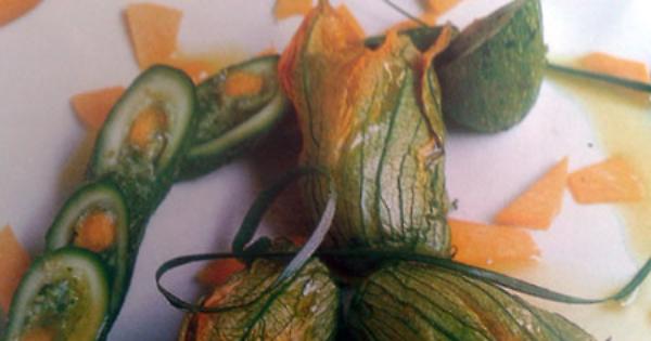 Lessare i fagiolini e le patate sbucciate e affettate, scolare bene, mettere nel mixer e frullare per qualche istante per amalgamare. Aggiungere gli aromi tritati, il pangrattato, il formaggio e le uova. Salare pepare e frullare ancora sino ad ottenere un composto abbastanza omogeneo. Spuntare le zucchine ed asportare la parte interna, aprire leggermente i fiori. Mettere il composto di verdure in una tasca da pasticciere con una bocchetta larga a stella. Strizzare il composto nelle zucchine svuotate e nei fiori (meglio che siano lasciati attaccati alle zucchine per evitare che esca il composto). Sistemare il tutto su una placca unta di olio e cuocere in forno a 160°: i fiori per 15 minuti, le zucchine farcite per 25-30 minuti. Disporre poi al centro di ogni piatto tre fiori ed accanto una zucchina farcita a fettine e condire con olio extravergine di oliva.