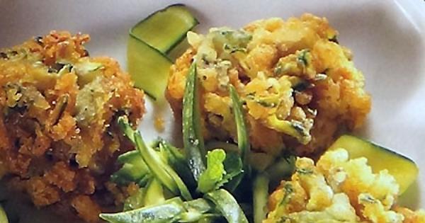 Aggiungere al composto le zucchine e le foglioline di menta tagliuzzate fini delicatamente, mescolando dall'alto al basso. Far scaldare l'olio in una padella, immergervi a cucchiaiate il composto e far dorare in modo omogeneo. Sgocciolare poi le frittelle con un mestolo forato, porle su un foglio di carta assorbente da cucina. Trasferire su un piatto da portata e servire.