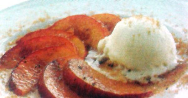Ingredienti (per 4 persone): 4 pesche noce mature e sode, cannella in polvere, pepe garofanato, zenzero in polvere, burro, 60 gr di zucchero di canna, 400 gr di gelato alla crema.