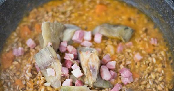 Ingredienti (per 4 persone): 340 gr di farro, 600 gr di zucca, 4 carciofi, pancetta (facoltativo), sale olio extravergine di oliva.