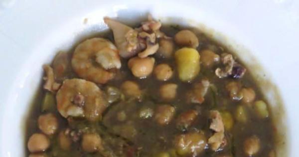 Ingredienti: 250 grammi di code di gambero sgusciate, 250 grammi di seppioline pulite, 200 gr di ceci lessati, 1 patata media, 1 carota, 1 cipolla piccola, 1 costa di sedano, 1 cucchiaino di nero di seppia, prezzemolo, 4 fette di pane raffermo, olio extravergine di oliva, sale e pepe.