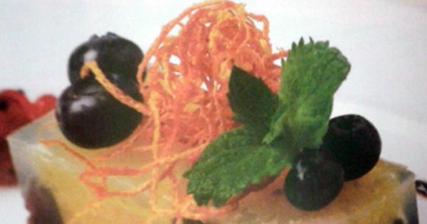 Ingredienti: 600 gr di arance, 150 gr di uva, 80 gr di mirtilli, 20 gr di zucchero semolato, 4 g di gelatina in fogli, 4 foglie di menta.