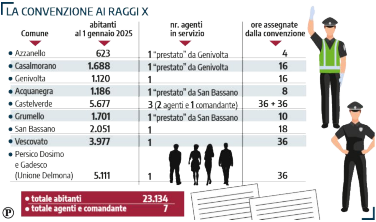 E chi tra loro non ha il vigile (vedi Acquanegra, Grumello, Casalmorano e Azzanello) se lo è fatto prestare da altri comuni. Sette (compreso il comandante) i ‘ghisa’ impiegati nel progetto pronto a decollare tra qualche mese. Capofila sarà Castelverde, che con i suoi quasi 6mila abitanti è il centro più popoloso, dove il comando avrà il suo quartier generale, a capo del quale ci sarà il commissario capo Alessandro Salimbeni.