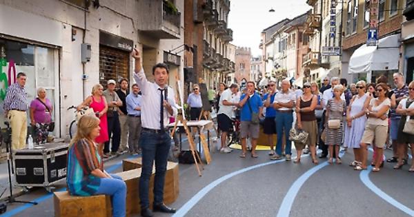 Ai lati delle immaginarie onde del Po, troppo azzurre per risultare realistiche, lungo i 160 metri di corso Garibaldi inseriti nel progetto di rigenerazione urbana, campeggiano le scritte ‘saldi’ su vetrine desolatamente vuote. I negozi chiusi dalla crisi del commercio fanno da triste quinta al palcoscenico inventato dal Comune di Cremona, dove si avvicendano da qui a settembre spettacoli e momenti di intrattenimento culturale per spettatori di tutte le età. I colori, i suoni e i giochi del singolare teatro a cielo aperto inventato dalla giunta Galimberti stridono con la fissità di negozi senza vita. Sono morti. Rianimare quelle botteghe è impresa ben più impegnativa di un progetto temporaneo di rigenerazione urbana, costato diecimila euro e che in ottobre svanirà come un mandala tibetano. Le onde colorate evaporeranno, ma intanto la spinta innovativa di un’idea provocatoria e un po’ rivoluzionaria avrà fatto breccia nel grigiore che avvolge la città. I cremonesi si dividono. Molti accolgono con favore la novità: sono sorpresi ma si lasciano coinvolgere. Sospendono il giudizio o ne danno uno positivo. Altri bocciano senza appello il primo intervento concreto della nuova Amministrazione sulla città. I puristi, indignati, considerano quelle pennellate variopinte sull’asfalto la profanazione di una città d’arte tra le più belle d’Italia. Voce fuori dal coro, Philippe Daverio, uno dei critici più rigorosi e competenti, già assessore al Comune di Milano benedice il fremito innovatore sollevato dal fiume urbano che sarebbe piaciuto al suo collega Renato Nicolini. Se l’obbiettivo era far parlare di sè con poca spesa, il progetto è perfettamente riuscito. Si parla, si discute, si litiga. Il confronto viaggia sui social network e suscita curiosità.