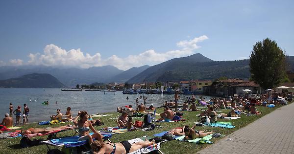 ISEO (19 luglio 2020) - A Iseo i bagnanti in spiaggia con le linee segnate sull'erba per evitare gli assembramenti e in settimana ci saranno gli steward per controllare gli accessi.