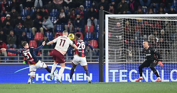 BOLOGNA - La Roma acciuffa all'ultimo respiro il 2-2 al Dall'Ara contro il Bologna: dopo il vantaggio giallorosso di Alexis Saelemaekers e la rimonta rossoblù firmata da Thijs Dallinga e Lewis Ferguson (su rigore), è Artem Dovbyk a siglare dagli undici metri, a recupero inoltrato, il definitivo pareggio. Dopo un'iniziale fase di studio, è la formazione di casa a ritagliarsi la prima occasione da rete all'11' con una conclusione da posizione defilata di Dallinga, che viene deviata in calcio d'angolo da Svilar. Il ritmo della gara è buono, ma le chance da gol latitano da entrambe le parti. Al 31' arriva la prima vera occasione per la Roma: sugli sviluppi di un corner Paredes, su suggerimento di Dybala, lascia partire un bel tiro che viene respinto da Skorupski; sulla ribattuta ci prova Dovbyk, ma il portiere polacco non si fa sorprendere. Gli uomini di Claudio Ranieri alzano il ritmo e quattro minuti dopo cercano di approfittare di un errore di Lucumì per colpire in contropiede con Dybala, che però calcia alto sopra la traversa. Nel finale di primo tempo Dominguez si rende pericoloso con una conclusione da buona posizione, ma centra solo l'esterno della rete. Nella ripresa la compagine giallorossa si affaccia nella metà campo avversaria andando al tiro con Koné ma la palla termina sul fondo. Il Bologna risponde alzando il proprio baricentro e pressando gli avversari ma ad andare in vantaggio sono i capitolini: al 58' Koné serve sulla destra Saelemaekers, il quale realizza l'1-0 dal limite dell'area anche grazie a un errore di Skorupski. Neanche il tempo di festeggiare per la Roma e i rossoblù replicano immediatamente agguantando il pareggio al 61' con Dallinga: gran contropiede innescato da Dominguez, che serve Ndoye, il quale a sua volta mette in mezzo per l'olandese che sigla il tap-in vincente. Qualche minuto dopo i ragazzi di Italiano conquistano anche un calcio di rigore per un fallo di mano di Koné: dagli undici metri si presenta Lewis Ferguson, che torna al gol e porta avanti i suoi. Gli emiliani, forti del vantaggio, provano a colpire in contropiede ma nè il neoentrato Orsolini nè Ferguson riescono a trovare il 3-1. La squadra giallorossa cerca così l'assalto finale e nel recupero Lucumì commette fallo di mano in area. Abisso, dopo una revisione al monitor su chiamata del Var, assegna il rigore agli uomini di Ranieri: Dovbyk, con estrema freddezza, firma il definitivo 2-2 al minuto 98. - foto Ipa Agency - . spf/glb/red 12-Gen-25 20:16