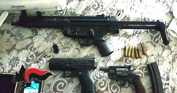 NAPOLI - I carabinieri della stazione di Boscoreale (Na) hanno scoperto un arsenale all'interno di un garage di via Sardoncelli e arrestato il proprietario M.P. di 48 anni e il 42enne D.A., entrambi già noti alle forze dell'ordine. Nel corso della perquisizione i militarii hanno rinvenuto e sequestrato una pistola arminius calibro 38 special con matricola abrasa e carica di colpi che D.A. nascondeva sotto la maglia. Trovate poi una pistola mitragliatrice MP5 calibro 9 con il caricatore pieno di 24 proiettili, una pistola Walther ppx calibro 9 con matricola abrasa carica di 7 proiettili nel serbatoio, una pistola Glock calibro 9, anche questa con matricola abrasa, con 15 proiettili nel caricatore. Ritrovati anche 2 ordigni esplosivi artigianali dal peso di 140 grammi ciascuno. Sequestrati anche una pistola a salve e 204 proiettili di vario calibro e 169 grammi di cocaina. Le perquisizioni si estendevano anche nelle rispettive abitazioni e i carabinieri trovavano 1 Kalashnikov con 2 caricatori pieni per un totale di 51 colpi. Rivenuti infine 10 grammi di cocaina e 53 grammi di hashish. foto: ufficio stampa Carabinieri . tvi/com 23-Mar-25 09:05