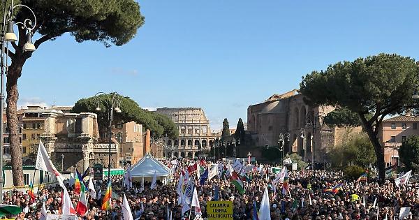 ROMA - In centomila per dare un messaggio "chiaro e forte" al governo: 'no' a "questo folle piano di riarmo. L'Europa deve porre fine a questa guerra altrimenti questa guerra porrà fine all'Europa". Dal palco della manifestazione del Movimento 5 Stelle a Roma, il leader Giuseppe Conte posa "il primo pilastro dell'alternativa a questo vergognoso governo: l'idea centrale sarà il 'no' al riarmo e ai tagli a sanità, scuola e lavoro, ma maggiori investimenti per quello che realmente ci serve". "C'è una crisi della coscienza europea: stanno affogando i principi europei e i valori della nostra Costituzione sotto un cumulo di falsità e di ipocrisie", ma "oggi si rompe quella farlocca luna di miele che Meloni ha costruito con le menzogne e con le bugie", continua Conte, secondo cui gli 800 miliardi messi in campo dall'Europa sono "buttati non per un progetto serio di difesa europea che ci consentirebbe di costruire un orizzonte di sicurezza, anche con un risparmio di spesa", ma per "armare i singoli Paesi". Questo significa "consentire a chi ha la capacità fiscale, come la Germania, di diventare una superpotenza: è una strada senza ritorno, si crea una minaccia armata contro altre minacce armate. Sapete che succede? Che la guerra arriva davvero. Giorgia Meloni, senza nessun mandato e senza nessun voto, ha creato un disastro storico di cui risponderà per tutta la sua vita politica", sottolinea, attaccando la premier. "Si definisce underdog ma ha alle spalle 30 anni di vita politica e ha Crosetto accanto che le spiega che la lobby delle armi è potentissima e che, se vuole una lunga carriera, non deve scontentarla". Sul palco della manifestazione si sono alternati diversi esponenti del Movimento: tra gli altri l'ex presidente della Camera, Roberto Fico, la presidente della Regione Sardegna, Alessandra Todde, una delegazione di deputati, senatori ed europarlamentari, accompagnati dai capigruppo Riccardo Ricciardi, Stefano Patuanelli e Pasquale Tridico. "Via dei Fori Imperiali è piena fino al Colosseo, un'immagine incredibile", ha detto la vicepresidente M5S Paola Taverna. "Qualcuno voleva cancellare milioni di persone che votano per il Movimento 5 Stelle. Cancellare questa piazza, se siete capaci", ha aggiunto riferendosi alle parole del leader di Azione, Carlo Calenda. "Quando dicono che il Movimento 5 stelle deve essere cancellato o che è morto noi rispondiamo così, con questa piazza piena, pienissima", ha aggiunto la vicepresidente M5S Chiara Appendino. Sul palco anche Marco Travaglio, poi un videomessaggio dello storico Alessandro Barbero, l'intervento dell'economista Jeffrey Sachs e quello dell'eurodeputato belga del Partito del Lavoro, Marc Botenga. Tra gli speaker anche i soci fondatori di Alleanza Verdi Sinistra, Nicola Fratoianni e Angelo Bonelli, il segretario di Rifondazione Comunista Maurizio Acerbo, mentre in piazza era presente una delegazione del Pd guidata dal capogruppo al Senato, Francesco Boccia. foto: ufficio stampa M5S . xi2/tvi/red 05-Apr-25 19:27