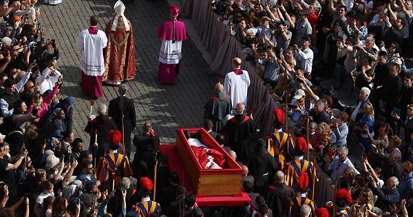 CITTÀ DEL VATICANO - Si è svolto il rito della traslazione della salma di Papa Francesco dalla Cappella della Domus Santa Marta alla Basilica di San Pietro, secondo quanto previsto nell'Ordo Exsequiarum Romani Pontificis. Dopo il momento di preghiera, presieduto dal cardinale Kevin Joseph Farrell, Camerlengo di Santa Romana Chiesa, è iniziata la processione dalla Cappella della Domus, con i Cardinali e i Patriarchi, seguiti dal Cardinale Camerlengo e dal Maestro delle Celebrazioni. I Barellieri-Sediari hanno portato la bara del defunto Pontefice, seguiti dai Segretari, Familiari e anticamera. La processione ha percorso la Via della Sacrestia, passando per la Piazza dei Protomartiri Romani ed è uscita in Piazza San Pietro passando per l'Arco delle Campane. Dopo il settore San Pietro la processione si è diretta verso il centro della piazza, accolta da un lungo applauso della folla dei fedeli presenti. Poi l'ingresso nella Basilica di San Pietro dal portone centrale. Il feretro di Papa Francesco è stato posto a terra davanti all'altare maggiore della Basilica su una semplice pedana, senza catafalco, come era stato disposto dallo stesso pontefice. Il cardinale Farrell ha poi officiato la Liturgia della Parola, e dalle 11 sarà possibile l'omaggio dei fedeli alla salma del Papa. - Foto IPA Agency - . sat/red 23-Apr-25 10:28