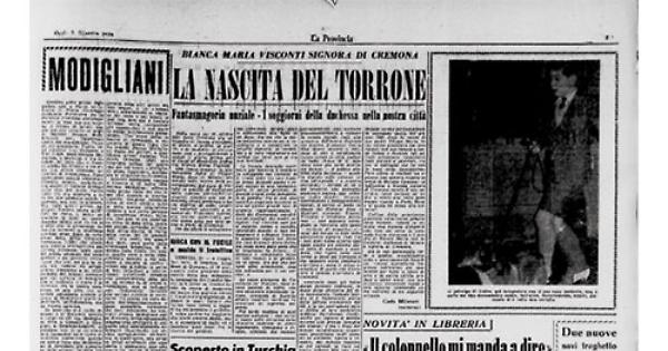 .......fra i vari doni viene offerto agli Sposi anche un enorme dolce fatto di zucchero e mandorle, che ripete nella sua forma le linee del Torrazzo, e che appunto viene chiamato « torrione »: ossia il primo esemplare di quello che diventerà il famoso « torrone » di Cremona.