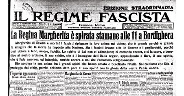 I fascisti ripiegano la loro anima nel dolore, che è grande perchè è grande la sciagura che la morte ha imposto alla Nazione. Ma i fascisti levano alte le fiamme e i gagliardetti, perchè quel dolore è fede, amore, fedeltà. Lo spirito di Lei non ci abbandona; ci comanda ancora, e ci fa cuore, e benedice al nostro eroismo. Il suo spirito, che è l'immagine dell' Italia regale, appassionato e fiero, il suo spirito, che è fede amorosa ed intrepida, sorride ancora a noi che l'amammo religiosamente.
