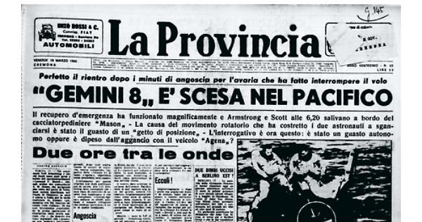 Il recupero d'emergenza ha funzionato magnificamente e Armstrong e Scott alle 6,20 salivano a bordo del cacciatorpediniere " Mason „ - La causa del movimento rotatorio che ha costretto i due astronauti a sganciarsi è stato il guasto di un ''getto di posizione'' - L'interrogativo è ora questo: è stato un guasto autonomo oppure è dipeso dall'aggancio con il veicolo "Agena„?