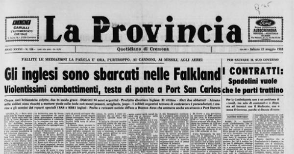 Cinque navi brltanniche colpite, due in modo grave - Distrutti 14 aerei argentini - Precipita elicottero inglese: 21 vittime - Altri due abbattuti - Almeno mille soldati sono riusciti a mettere piede sulle isole con mezzi pesanti, artiglieria, jeeps - I soldati argentini tentano di contrastare ì paracadutisti, i marine e gli uomini dei reparti speciali (SAS e SBS) inglesi - Poche e reticenti notizie diffuse a Buenos Aires che ammette anche un attacco a Port Darwin