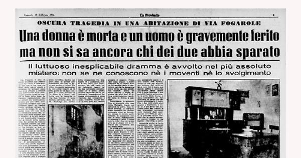 Via Fogarole è una di quelle stradette che sboccano in via Aselli. E' una strada che, con le sue case cadenti dalle pareti stinte e scrostate, fa pensare come mai ci si affanni a cercare aree fabbricabili nelle camnagne quando quasi in centro vi sono tante zone da risanare radicalmente. Sono abituri che costituiscono un'onta per una città; sono miserevoli casupole che una avveduta opera di risanamento avrebbe dovuto far sparire da tempo. In una di queste case, ieri alle 13,30, si è verificata quella che almeno allo stato attuale delle indagini, è la più oscura, la più inesplicabile tragedia che si ricordi nella nostra città. La polizia ha tentato di togliere almeno un lembo di velo da questo mistero; ha tentato, se non. altro, di assodare chi abbia esploso i colpi di rivoltella che hanno ucciso una donna ed hanno ferito forse mortalmente un uomo; ma non si è potuto venire a capo neppur di questo enigma; e probabilmente, se l'uomo non potrà sopravvìvere alla gravissima ferita, non si potrà mai sapere con piena certezza chi sia stato l'uccisore e chi la vittima.
