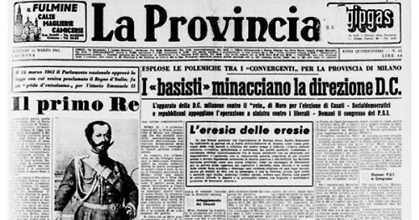 Memorabile seduta, quella del 14 marzo 1861, al Parlamento nazionale di Torino: venne approvato all'unanimità il disegno di legge con cui veniva proclamato il Regno d'Italia. L'articolo unico della legge diceva: "Il Re Vittorio Emanuele II assume per sè e i suoi successori il titolo di Re d'Italia". Era il coronamento storico della lunga odissea risorgimentale, la conclusione politica di tanti sacrifici, di tante congiure e di tanti eroismi. Nasceva, dopo le insurrezioni popolari, le guerre d'indipendenza e le spedizioni garibaldine il nuovo stato italiano.
