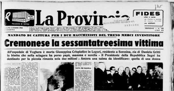 Mandato di cattura per i due macchinisti del treno merci investitore. Cremonese la sessantatreesima vittima. All'ospedale di Voghera è morta Giuseppina Crispiatico in Legori, residente a Soresina, zia di Daniela Gritti la bimba che nella sciagura ha perso papà, mamma e sorella - 11 Presidente della Repubblica Segni ha destinato per la piccola rimasta sola due milioni - Ancora una salma da identificare: quella di una donna.