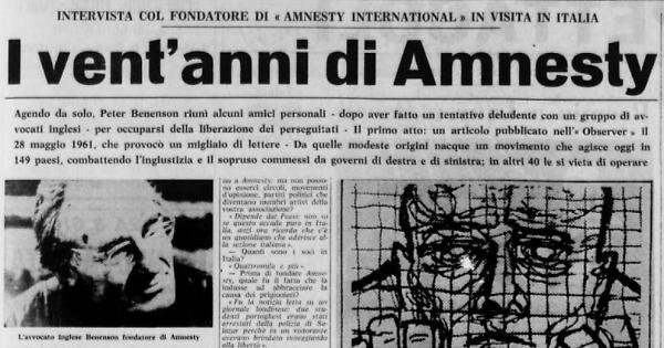 Agendo da solo, Peter Benenson riunì alcuni amici personali - dopo aver fatto un tentativo deludente con un gruppo di avvocati inglesi - per occuparsi della liberazione dei perseguitati. Il primo atto: un articolo pubblicato nell'« Observer » il 28 maggio 1961, che provocò un migliaio di lettere - Da quelle modeste origini nacque un movimento che agisce oggi in 149 paesi, combattendo l'ingiustizia e il sopruso commessi da governi di destra e di sinistra; in altri 40 le si vieta di operare