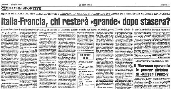 Il temino della giornata è ovviamente su questo giovane signore della pedata, che arrota la «r» come ogni buon francese. Come si può bloccare? È conveniente dedicargli un uomo che lo annulli e si annulli? È il tipo che si innervosisce? A svolgerlo sono chiamati gli uomini di Bearzot ha tenuto sulla corda fino all'ultimo per destinare alla sua marcatura: Bagni, Baresi, De Napoli, lo stesso Tardelli. Beppe Baresi, il suo francobollatore nell'Inter: «Ha più pregi che punti deboli. È ovvio. L'unica cosa che soffre un po' è la marcatura asfissiante. Solo cosi si può circoscriverlo. Ma non innervosirlo, a meno che per lui questa non rappresenti una giornata particolare. Io l'ho sempre trovato un avversario tranquillo e molto corretto. Comunque non è che bloccando Platini si blocchi tutta la Francia. È la squadra ad essere valida, a cominciare dagli altri centrocampisti Tigana, Giresse, Fernandez, fior di giocatori». Salvatore Bagni, il custode di Maradona: «Annullare un uomo per parte, soprattutto quando da quell'altra parte si chiama Platini, per me andrebbe benissimo. E un sacrificio che va messo in preventivo, quando si marca individualmente gente come Maradona o Platini, che sono tra i migliori al mondo e che, in ogni momento, possono decidere. A loro non bisogna mai dare l'opportunità di girarsi. Se è un incarico di prestigio? E perchè? In campo si va in undici, ciascuno con compiti ben precisi. No, Platini non l'ho mai visto nervoso, è uno che gioca tranquillamente la sua partita. Ma è anche intelligente: se vede che è marcato stretto, va a giocare più indietro. Non si è mai lamentato, ma anche Maradona non si lamenta, a meno che non lo picchino come hanno fatto qui, botte con la palla lontana tre metri. Allora anche lui non ci sta, come è giusto che sia. Se si tratta solo di prenderle, uno sta a casa». Nando De Napoli, la rivelazione, che si è preso già cura di Platini in Avellino - Juventus: «Chi mi viene dato da marcare io marco. Giresse, Tigana, Fernandez, lo stesso Platini. Tanto è il centrocampo francese ad essere forte nel suo insieme. Platini non ti rompe mai le scatole, non si lamenta anche se gli dai qualche calcio in più».