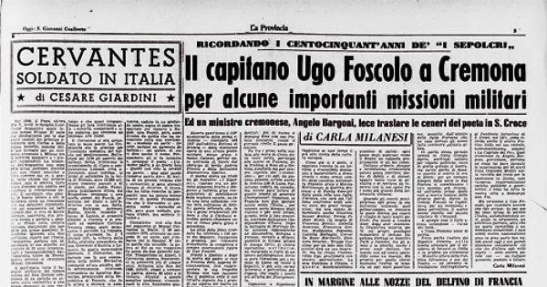 Forse anche l'autore dei Sepolcri fremeva nella tomba straniera per il desiderio di tornare in Italia e fu proprio un cremonese — Ministro allora della Pubblica Istruzione e poi del Tesoro — ad ottenere la traslazione dall'Inghilterra al Pantheon fiorentino di S. Croce, nel 1871, come ricorda anche il nostro Fiorino Soldi nel suo recente, interessantissimo volume « La Capitale del Po ». Quel cremonese fu Angelo Bargoni, giornalista, patriota ed esule lui pure durante le insurrezione del '48, aiutò Gian Giacomo Medici nella raccolta dei fondi per la spedizione in Sicilia, indi ricoperse importantissime cariche politiche e governative, e bene ha fatto la nostra città a dedicargli una Via.