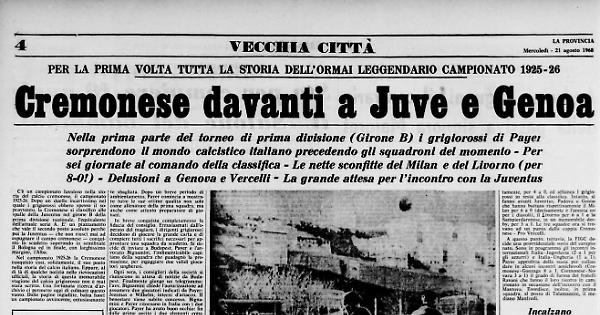 C'è un campionato favoloso nella storia del calcio cremonese, il campionato 1925-26. Dopo un duello incertissimo nel quale i grigiorossi ebbero spesso il sopravvento, la Cremonese si classificò alle spalle della Juventus nel girone B della prima divisione nazionale, l'equivalente dell'attuale serie A. E' un piazzamento che vale il secondo posto assoluto perche poi la Juventus — che non riuscì mai ad espugnare il campo cremonese — conquistò lo scudetto superando in semifinale il Bologna ed in finale, con larghissimo margine, l'Alba.