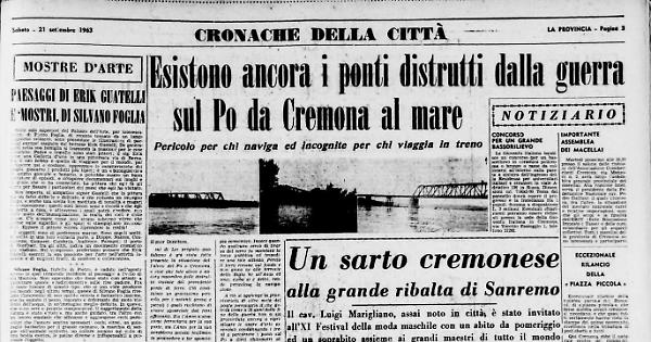 sul di Lei pregiato quotidiano è già stata fatta presente la situazione dell’alveo del Po a Cremona, e cioè che tale alveo è ancora ingombro delle distrutte travate del precedente ponte di ferro. Ciò costituisce un gravissimo pericolo per i natanti grossi e piccoli i quali rischiano di venire squarciati dai ferri affioranti. Sia l’Amministrazione ferroviaria per la sua parte, sia l'Anas per la sua avrebbero potuto facilmente provvedere a far sgomberare l'alveo dopo ben diciotto anni dalla fine delle ostilità ovvero avrebbero potuto invitare chi ne avesse voglia a tirar su il ferro tenendoselo come compenso.