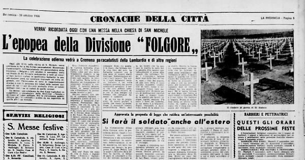 La celebrazione odierna vedrà a Cremona rappresentanti della Lombardia e di altre regioni nell'anniversario dell'immolazione dei paracadutisti della Divisione «Folgore» (23 ottobre – 6 novembre 1942) e di tutti gli eroici soldati italiani caduti sul fronte di El Alamein
