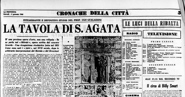 Si ritorna a parlare della «Tavola di S. Agata»; questa volta, però, il discorso dovrebbe essere già giunto al suo termine perchè il prof. Ugo Gualazzini, che nel 1925, ancora studente universitario, ebbe il merito di affrontare la ricognizione del cimelio recante la immagine della santa, ha offerto in un suo recentissimo studio, nuovi elementi in rapporto non soltanto alla validità del cimelio stesso, che e da considerarsi soltanto un prezioso monumento di pittura lombardo-romanica, ma alla sua storia e soprattutto alla leggenda che è stata alimentata dal sedicesimo secolo in avanti a causa di una cattiva interpretazione dei testi antichi.