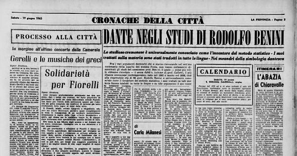 Fra i vari argomenti danteschi che si stanno rievocando nel settimo centenario della nascita del sommo Poeta, non vanno certamente dimenticati gli studi del cremonese prof. Benini, il quale — come più volte abbiamo ricordato — è senza dubbio, insieme al prof. Galletti, il più illustre cremonese contemporaneo, nato nel 1862 e morto nel 1956, cioè alla rispettabile età di 96 anni.