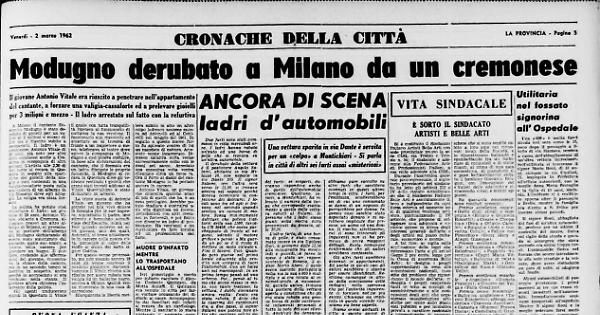 A Milano il cantante Domenico Modugno è stato derubato di gioielli per un valore di 3 milioni e mezzo di lire ma è riuscito subito a recuperarli.