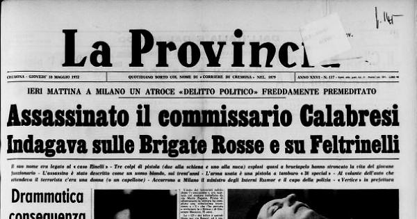 MILANO, 17. — Assassinato proditoriamente. Delitto di evidente ispirazione politica. Tre colpi (due alle spalle, uno alla nuca) hanno stroncato la vita del commissario Luigi Calabresi il cui nome fu legato alla tragica fine dell'anarchico Pinelli. Ed è stata forse la campagna d'odio montata contro il giovane funzionario di P. S. ad armare la mano dell'assassino che, secondo le prime indicazioni viene descritto come un uomo alto, sui trent'anni, biondo, vestito sportivamente. Il feroce crimine è stato compiuto stamane alle 9,15. Poco prima Luigi Calabresi che abitava al n. 6 di via Cherubini uno stabile signorile aveva salutato la moglie e i figli prima di recarsi in ufficio.