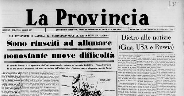 Questa foto è stata scattata la notte scorsa a Cremona dal Gruppo Astrofili Cremonesi, con apparecchiatura privata (ingrandimento fotografico 10 volte, ingrandimento totale 60 volte); la freccia indica il punto esatto nel quale gli astronauti sono allunati. Data la facilità del punto di riferimento, al limite tra la zona d'ombra e quella di luce, è possibile per chiunque, ad occhio nudo, vedere, sia pur approssimativamente, la zona d'azione di Scott e Irwin; le immagini TV completeranno la «partecipazione» di tutti all'impresa.