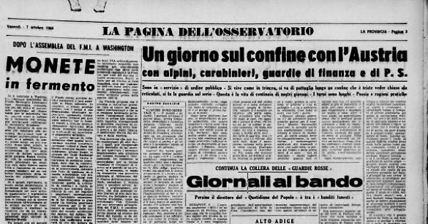 Guerra? No, niente guerra, soltanto ordine pubblico. La sigla «OP» (ordine pubblico) rappresenta da qualche anno una «destinazione» per i militari di stanza in Alto Adige: qualcosa come, sia pure con le debite proporzioni, il «fronte» durante la guerra. Andare in OP significa lasciare le caserme, il servizio di sentinella «formale» davanti al grande portone, lasciare la comoda libera uscita serale, l'appuntamento al bar o allo spaccio militare; lasciare anche le scomode «corvees» e le dure marce di addestramento. C'è soltanto una lunga marcia da fare, quella per arrivare lassù al distaccamento. Poi, assieme a pochi compagni, a un ufficiale, si vive come in trincea, si va di pattuglia lungo un confine che è triste vedere chiuso da reticolati («Come nel '15-'18» dice un ufficiale), si fa la guardia sul Meno in un abitacolo tutto imbottito di sacchetti di sabbia con una vera e propria feritoia.