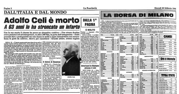 Vittorio Gassman, che insieme a Adolfo Celi aveva preparato, con i ragazzi della sua «Bottega fiorentina» lo spettacolo «I misteri di Pietroburgo» ha ricordato, con commosse parole, l'amico scomparso. «Sono sbigottito: Celi era felice del lavoro che avevamo preparato per questa "prima". La scomparsa di Adolfo Celi è per me una grande perdita; era un uomo di spettacolo, di grande umanità; per me un fratello; una guida ideale per questi ragazzi che, adesso, proseguono senza di lui, pur molto scossi, ma molto orgogliosi di andare avanti nel suo nome e nel suo ricordo». Gassman ha anche voluto ricordare di aver fatto, con Adolfo Celi e un altro amico, un film quasi autobiografico ed ora vedrà se, nel prossimo futuro, sarà il caso di proiettarlo.
