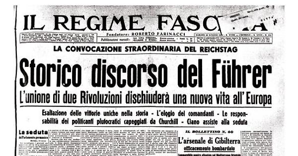 Adolfo Hitler ha pronunciato oggii al Reichstag, un discorso che produrrà certamente una profonda impressione in tutto il mondo e forse anche presso lo stesso popolo inglese, se pure la sconfinata libertà democratica gli concederà di conoscerlo. Il Cancelliere ha ricostruita la storia degli avvenimenti facendo ricadere, attraverso una serrata documentazione, la responsabilità del conflitto sull'Inghilterra e sulla Francia, le quali, sbagliando i calcoli, ritenevano giunto il momento propizio per schiacciare prima la Germania e poi l'Italia. I documenti rinvenuti nell'archivio segreto dello Stato Maggiore francese hanno portato alla luce la subdola premeditazione alleata di invadere il Belgio e l'Olanda. Ha poi parlato entusiasticamente dell'alleanza con l'Italia, esaltando l'enorme contributo che questa, nel campo politico, in quello economico, in quello militare, ha offerto alla Nazione germanica. E dopo avere rivolto il suo pensiero ai soldati caduti per la vittoria del Terzo Reich e dichiarato che le perdite tedesche sono relativamente lievi asserendo che il suo esercito è più che mai agguerrito, il FUhrer ha rinnovato al signor Churchill l'invito a riflettere ancora una volta sulle conseguenze del prolungamento di una guerra che porterebbe alla distruzione totale dell'Impero inglese. ...