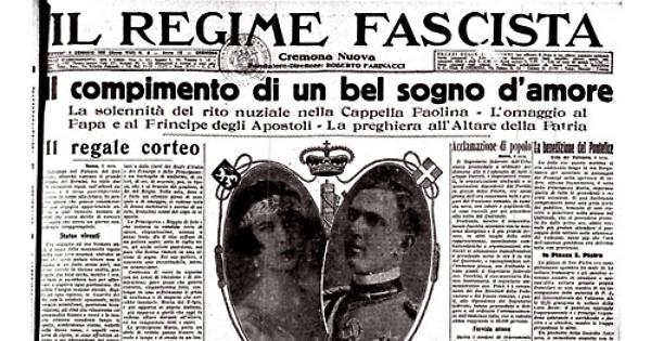 La moltitudine di cittadini e di fascisti, le organizzazioni sindacali e le associazioni patriottiche, i volontari di guerra, i combattenti, i decorati al valore, i reduci delle Patrie battaglie, tutti coloro che hanno voluto con questa manifestazionetrovarsi presenti dinanzi alla Reggia nel momento cui il rito nuziale si compie, sembra che vogliano seguire minuto per minuto,fase per fase, la storica cerimonia che si va svolgendo nella sala della Reggia.